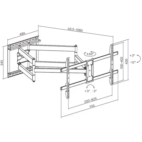 | Karakteristike | Tip: Nosač za TV Podržane dijagonale: 43"- 90" Maksimalno opterćenje: 0 kg Tilt: -12°~+3° Rotacija: 120° Rastojanje od zida: 60 - 1080 mm VESA: max 800 x 400 Materijal: Hladno brušeni metal |